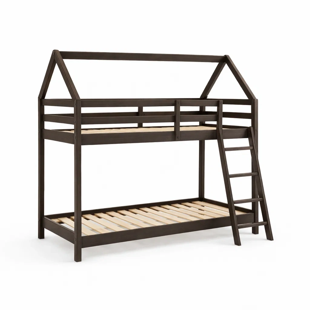 Letto a castello realizzato in legno con una scala integrata e design a forma di casetta.
