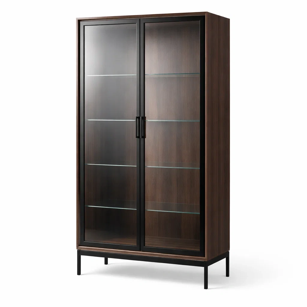 Questa vetrina è realizzata con un corpo in legno e una struttura in metallo. Le ante sono in vetro temperato di tipo trasparente. Presenta cinque ripiani interni regolabili in vetro di spessore 8 mm.